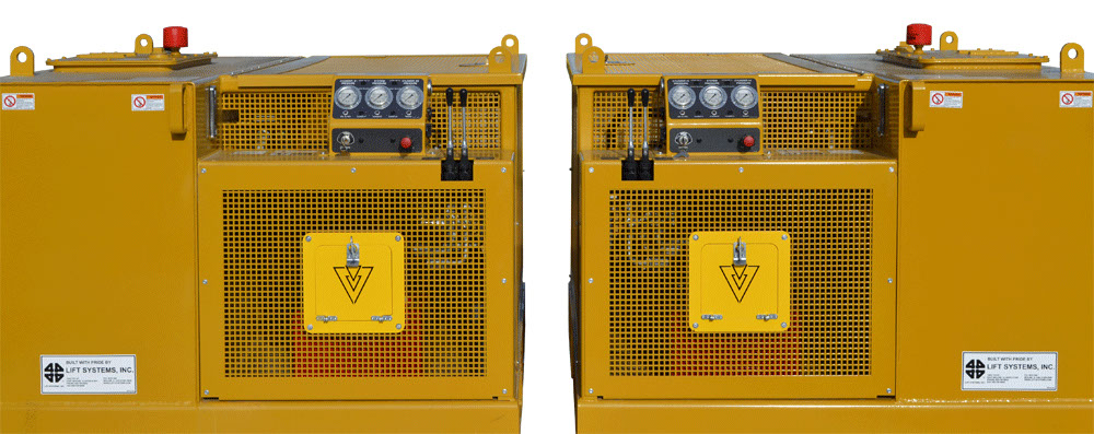 All Lift Systems Power Towers come standard with two power units. This allows for the system to be easily split between two projects, or for long loads such as long vessels. Our lockable, enclosed power units all feature large fork pockets, lifting lugs to allow for overhead lifting, and tie downs for transport. Both units are built as mirrored sets to allow for one operator to operate all four jack legs with ease on manually controlled units.